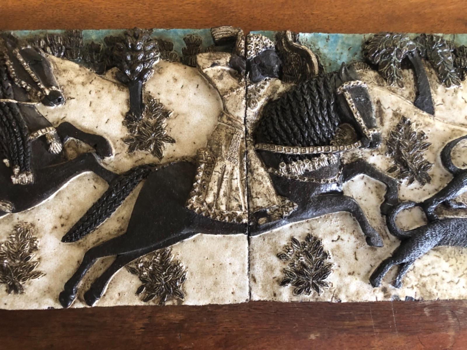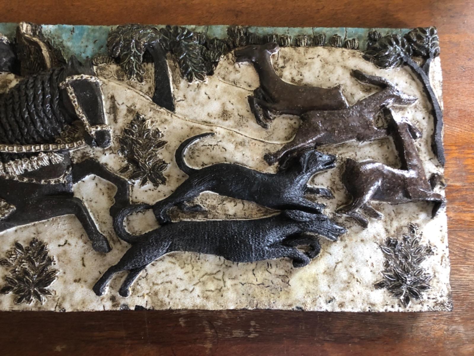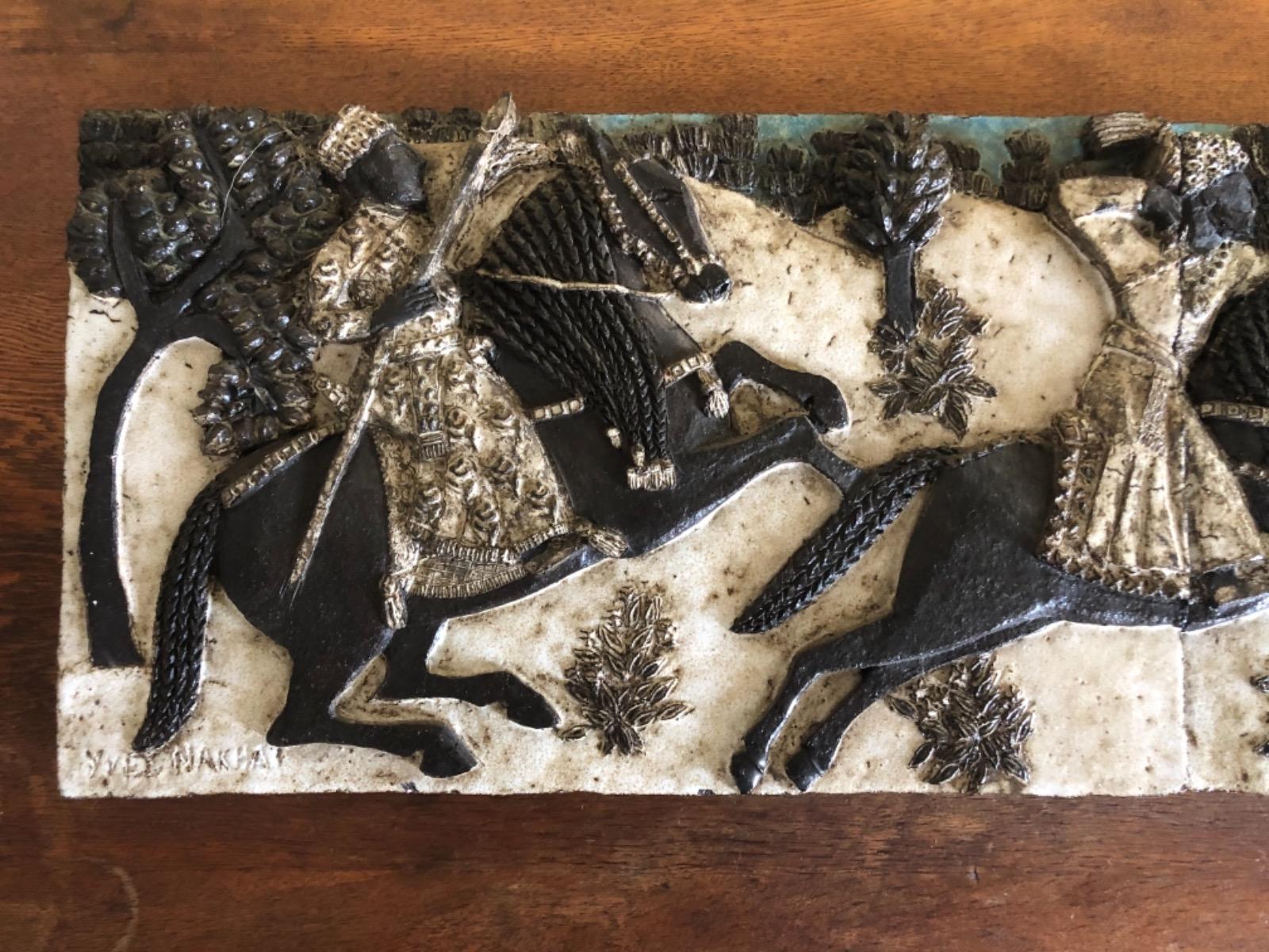 Bas relief en ceramique . Travail européen vers 1940 . Scène de chasse inspiré de la Perse . Signature en creux a déchiffrer .