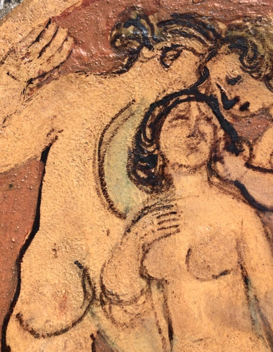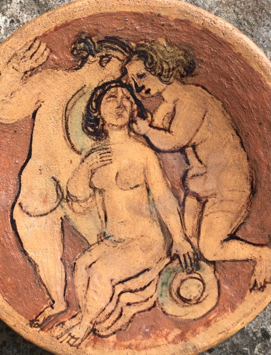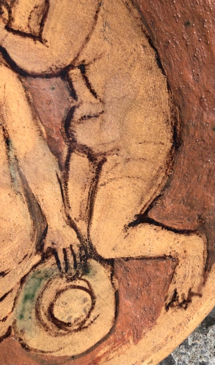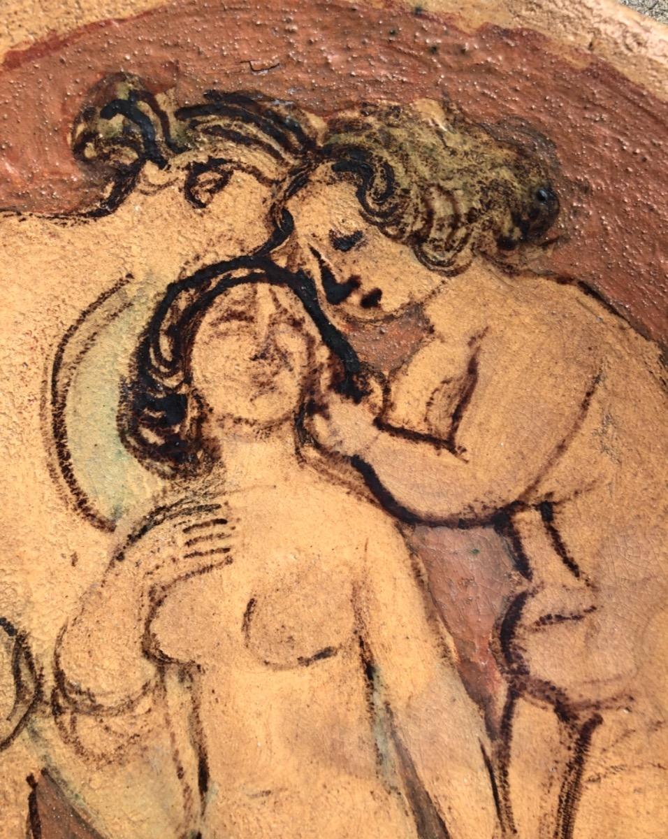 Maurice Savin . Pièce unique . Plat en terre cuite vernissée . « Les trois grâces ». Véritable céramique de peintre . France vers 1930 Signée au dos .