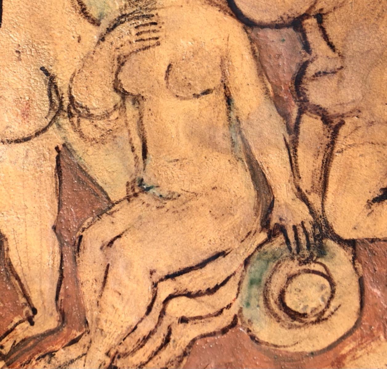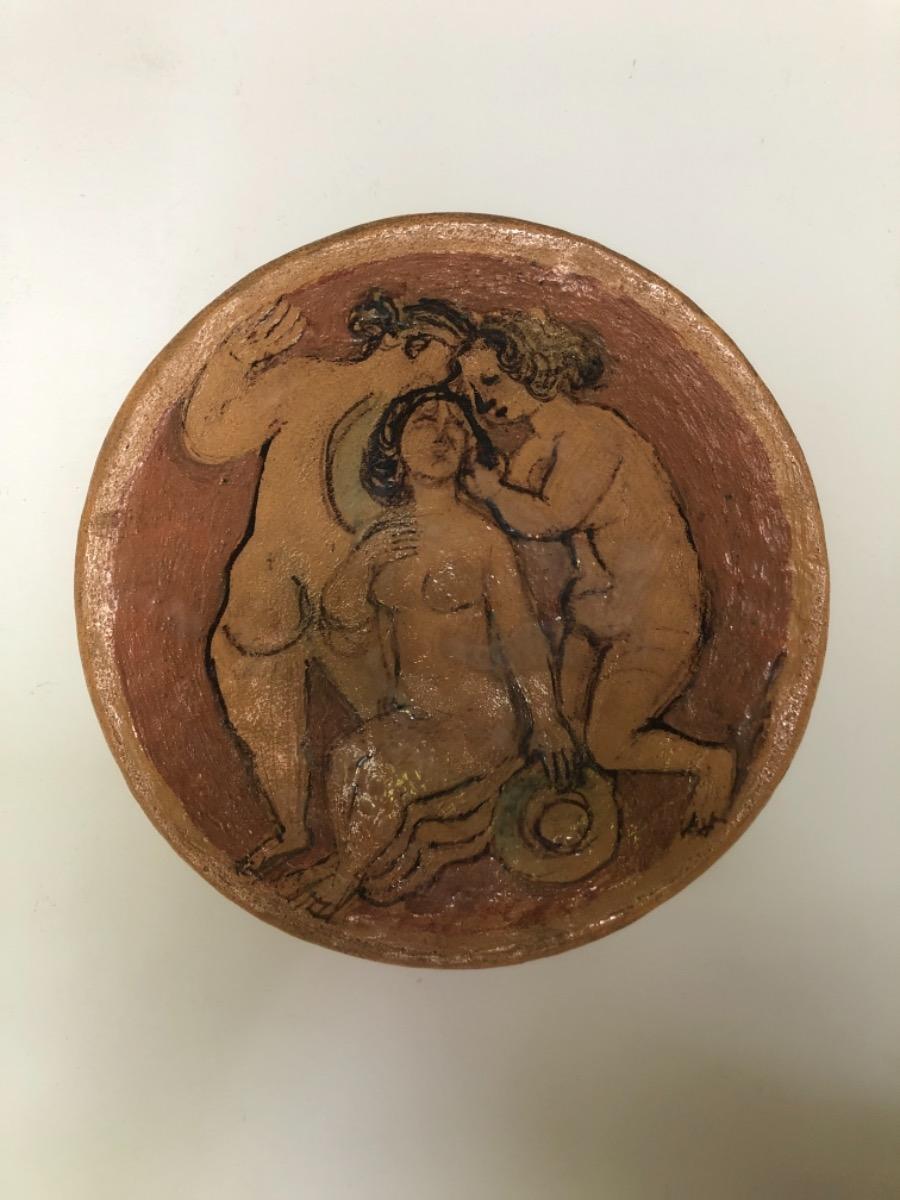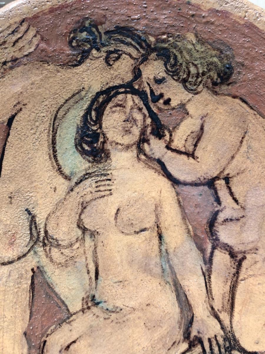 Maurice Savin . Pièce unique . Plat en terre cuite vernissée . « Les trois grâces ». Véritable céramique de peintre . France vers 1930 Signée au dos .