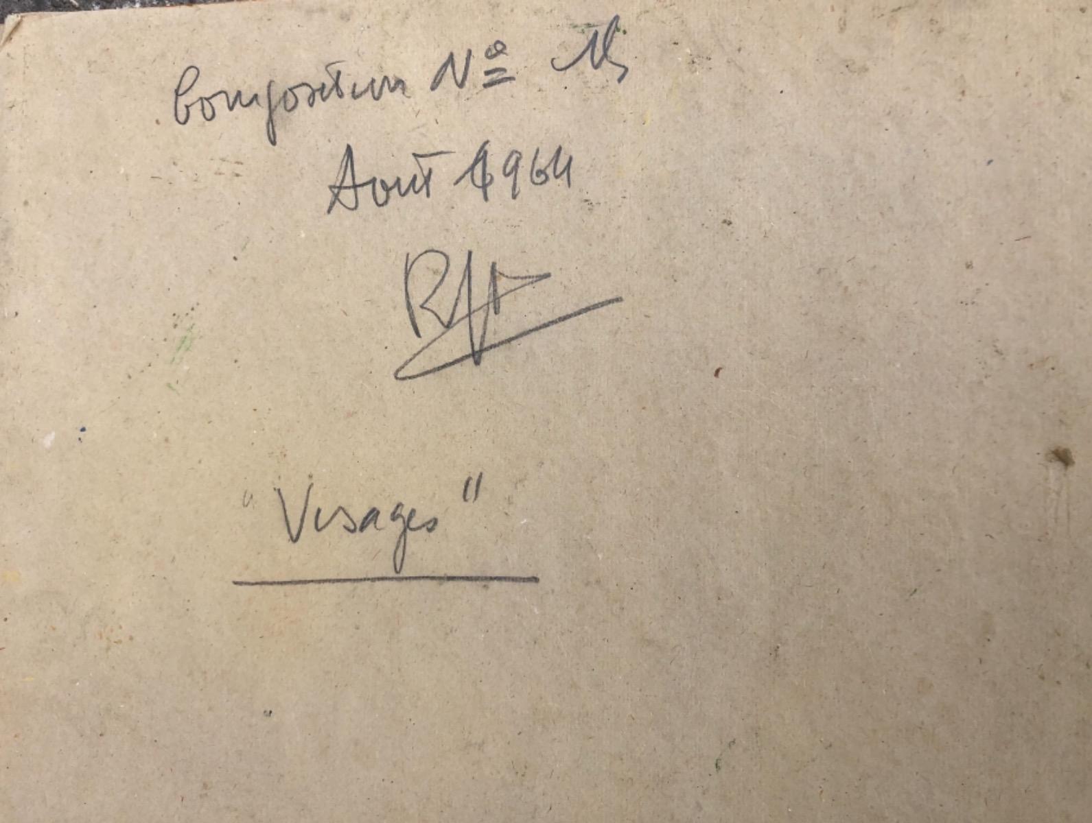 Raymond Gay Bellile ( XX eme ) . Nouvelle école de Toulouse . Technique mixte et collage sur carton . Signée en bas a droite . Contre signée au dos et annotée au dos composition N° 15 « visage ». Août 1964 .