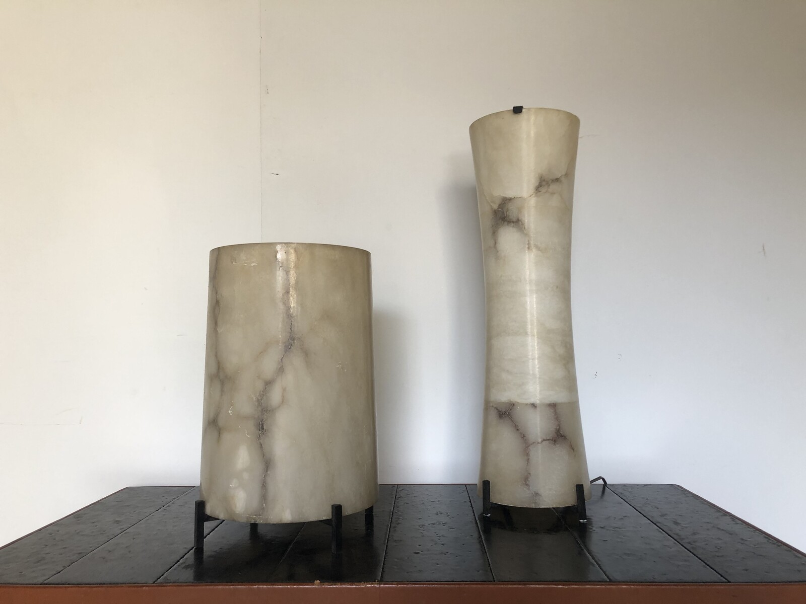 Paire de lampes italiennes circa 1970 . Piètement en fer forgé . Fûts en albâtre . Superbe lumière d’ambiance .