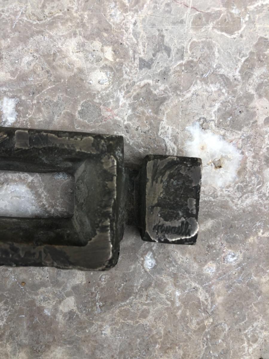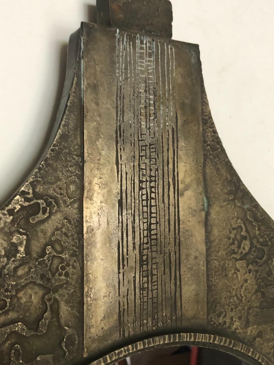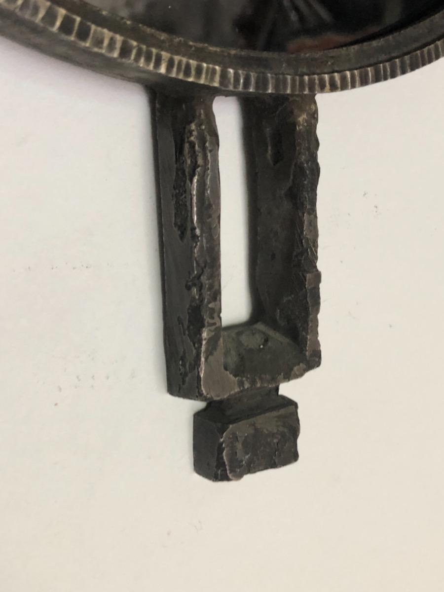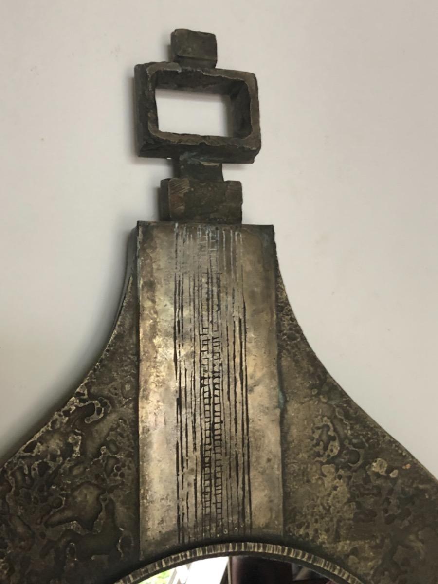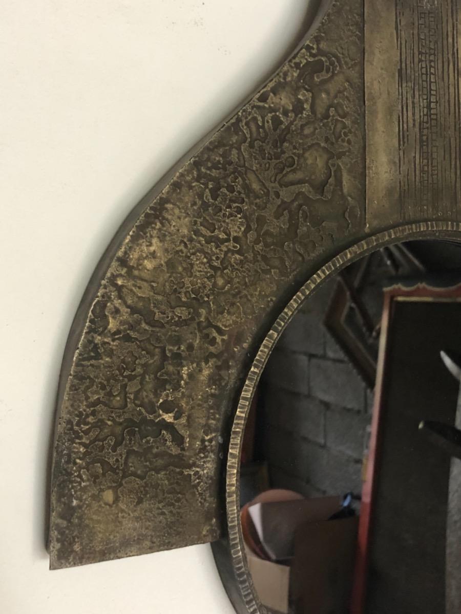Miroir italien en fer forgé battu et patiné . Travail d’artiste . Signé dans la masse. Signature a déchiffrer . Vers 1960