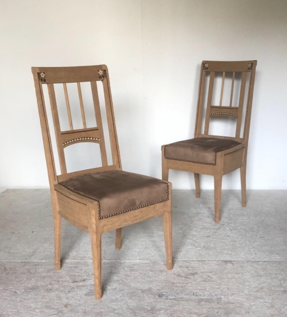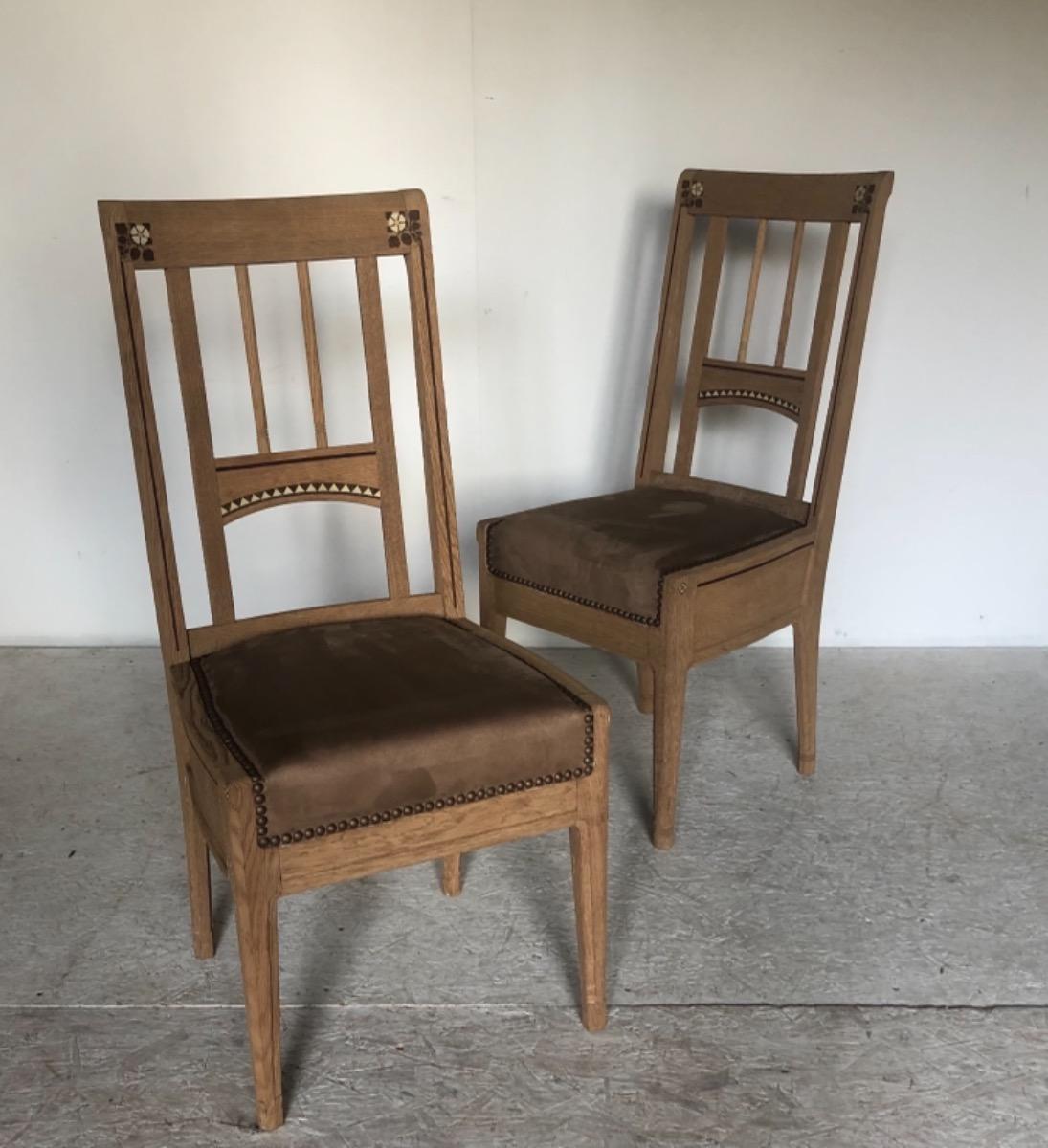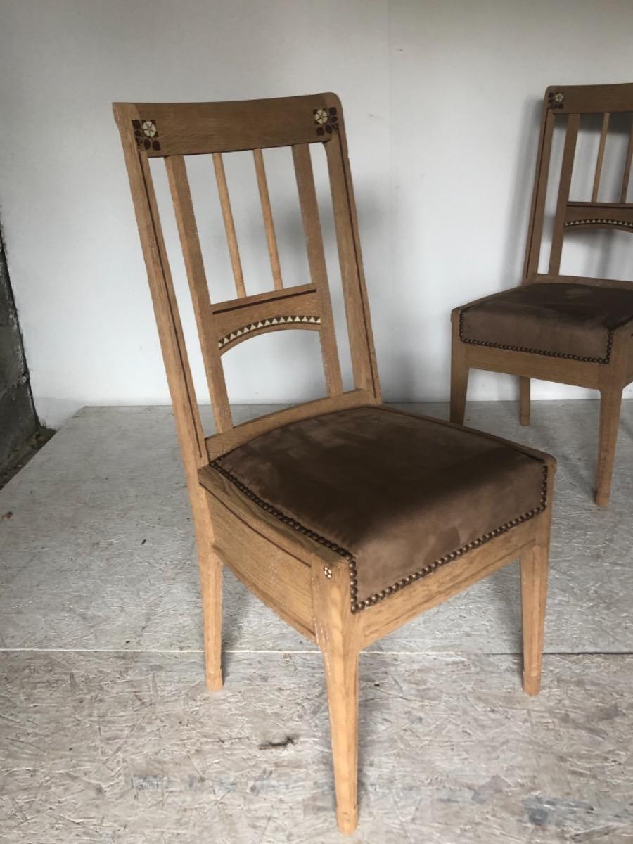 Paire de chaises Arts and Crafts vers 1910 . structure en chêne arraché. Décor en marqueterie . Couverture et garniture refaite a neuf . Finition clous bronze .