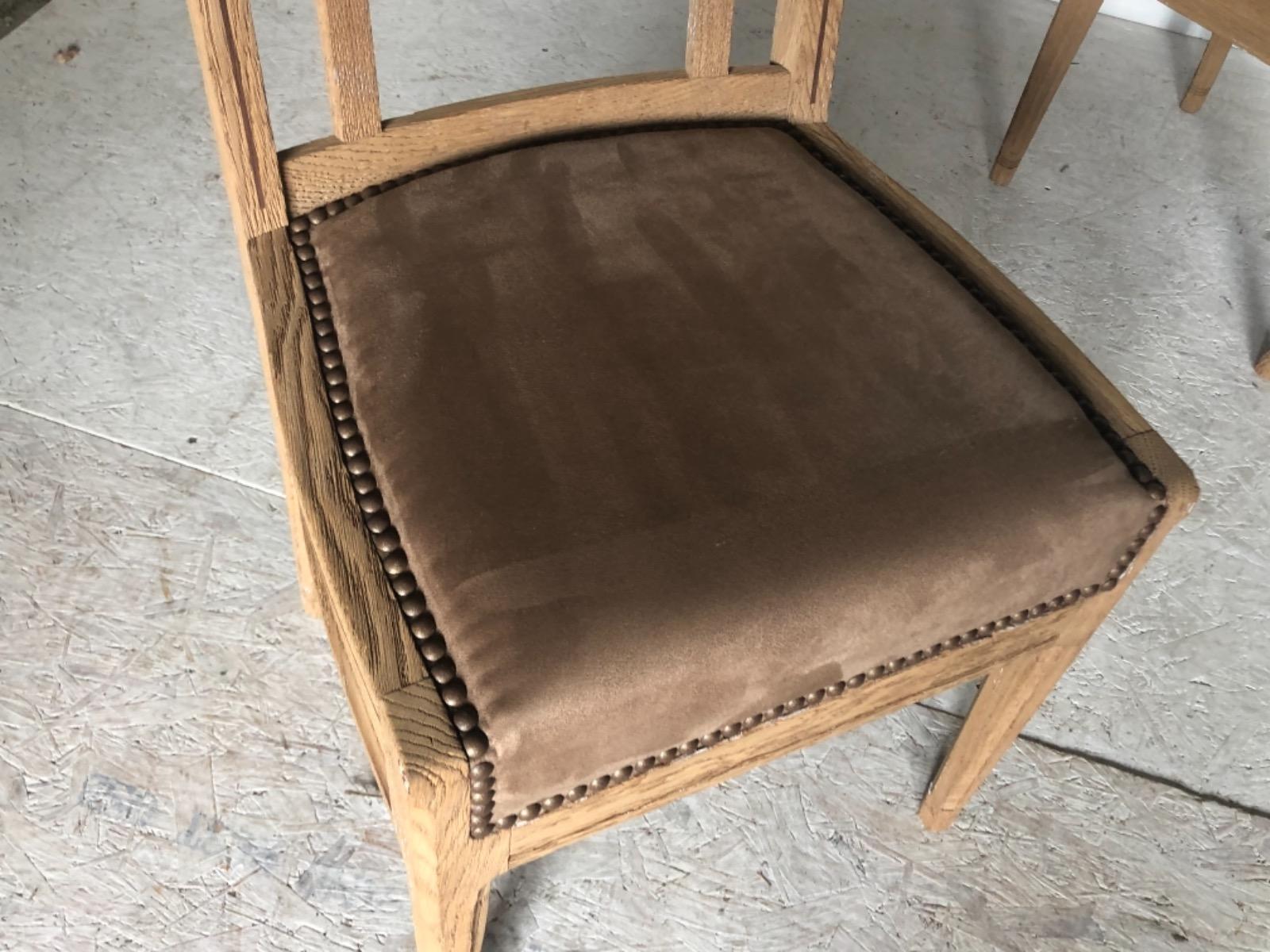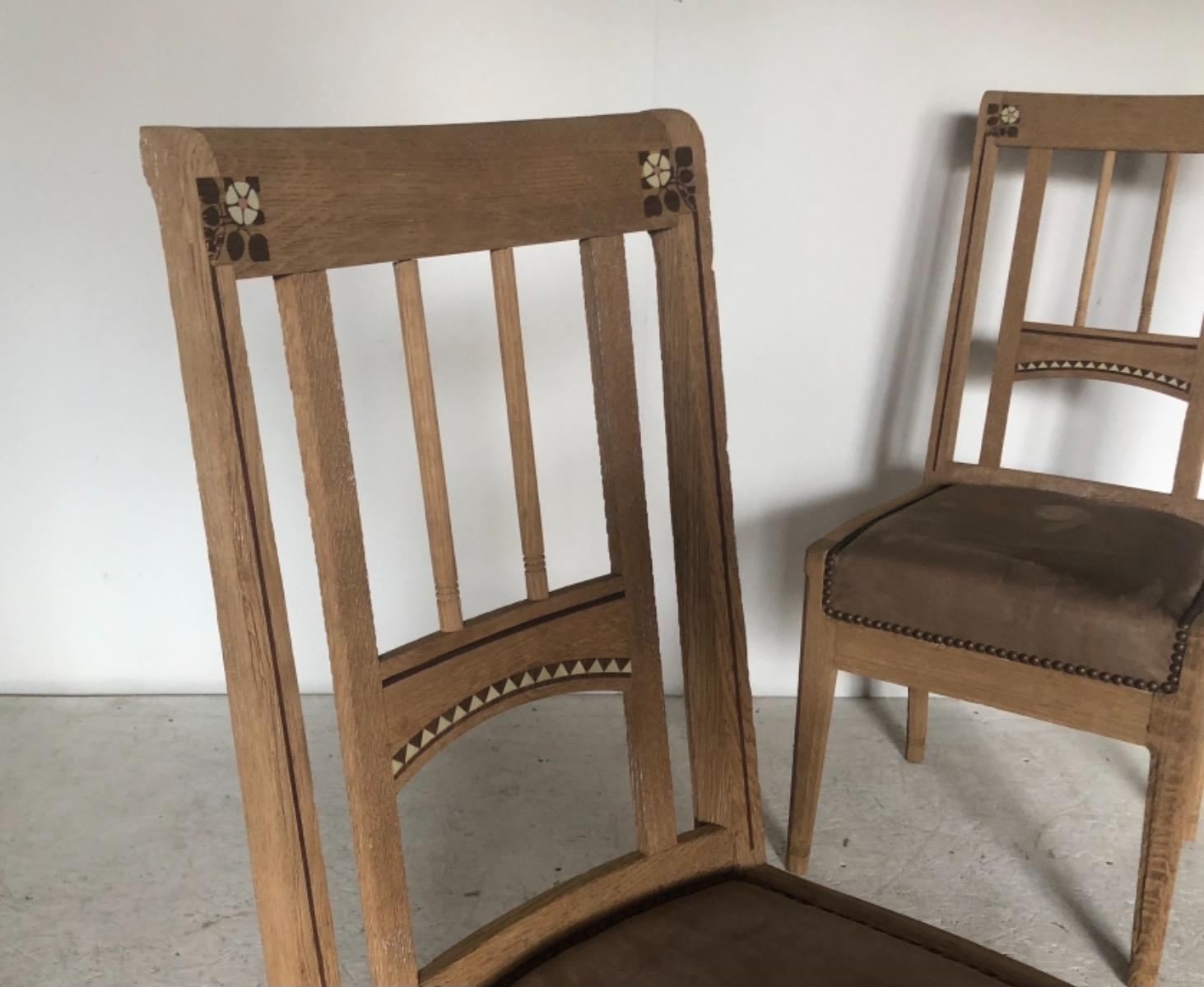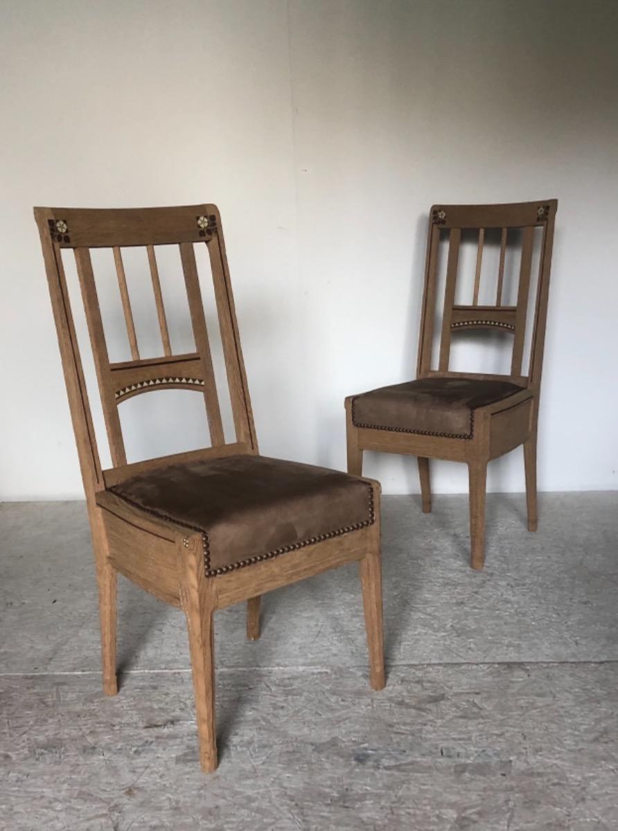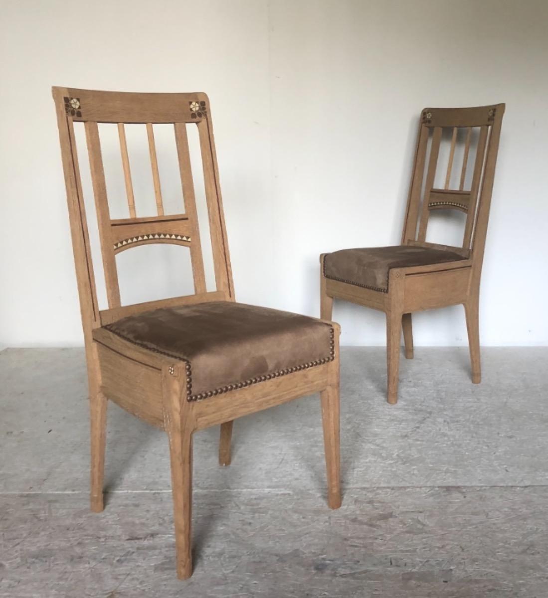 Paire de chaises Arts and Crafts vers 1910 . structure en chêne arraché. Décor en marqueterie . Couverture et garniture refaite a neuf . Finition clous bronze .