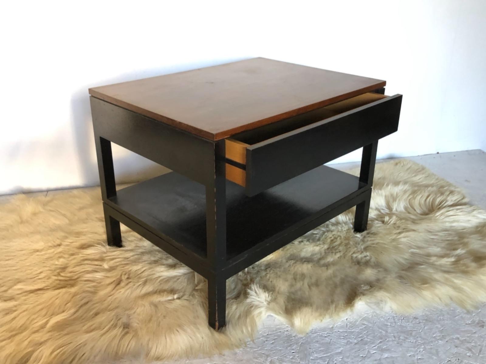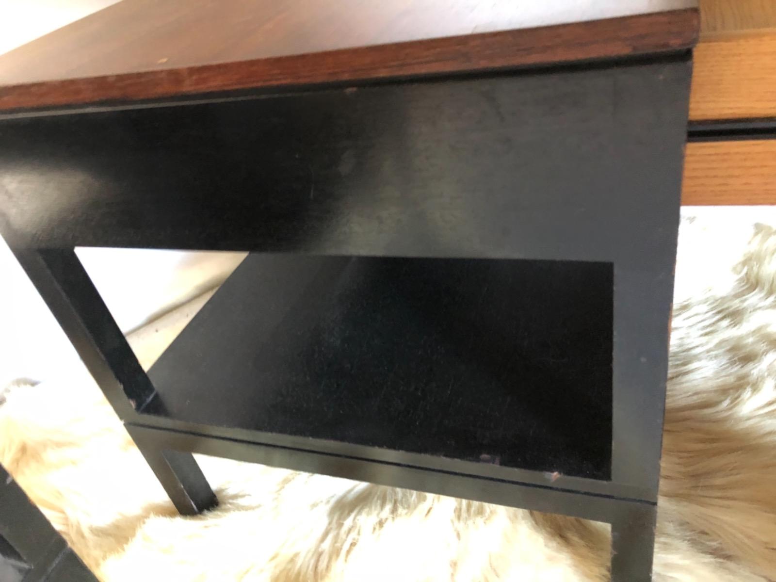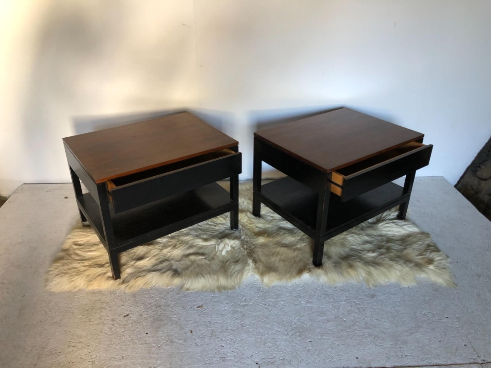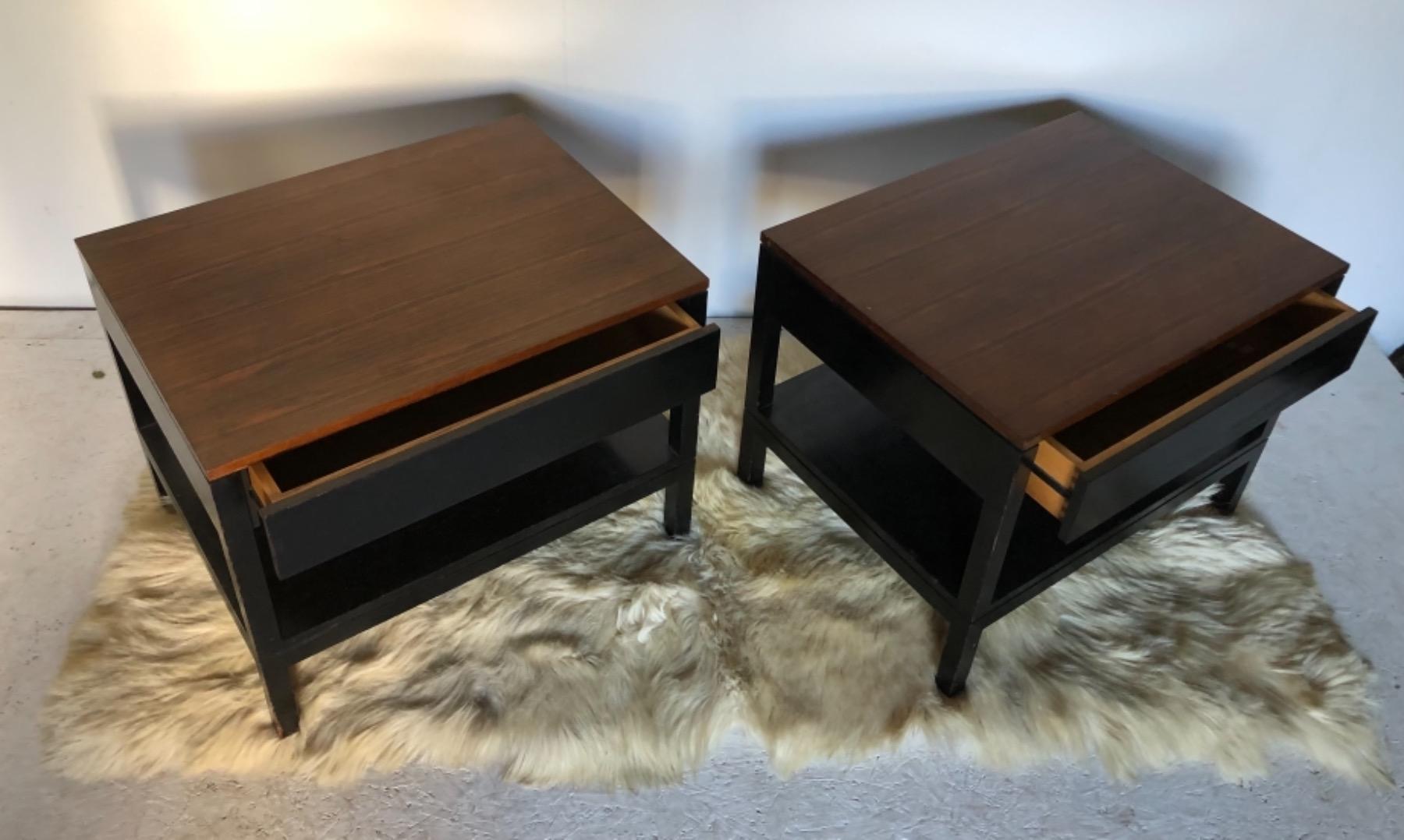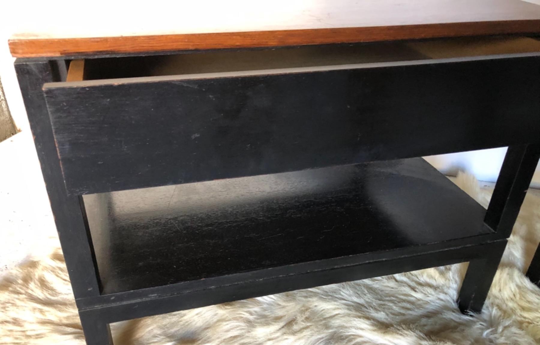 Paire de chevets . Époque 1970 . Structure en bois laqué noir . Plateau en placage de palissandre .
